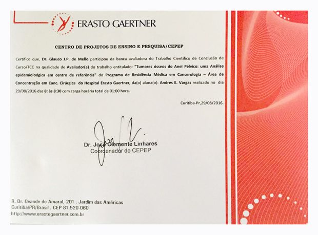 O Dr. Glauco Mello participou como avaliador esta semana de uma Banca do Centro de Projetos de Ensino e Pesquisa / CEPEP referente ao TCC: “Tumores Ósseos do Anel Pélvico: Uma análise epidemiológica em centro de referência” do Programa de Residência Médica em Cancerologia – Área de Concentração em Canc. Cirúrgica do Hospital Erasto Gaetner.